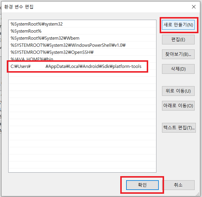[새로 만들기 클릭] -> [위의 경로 붙여넣기] -> [확인]